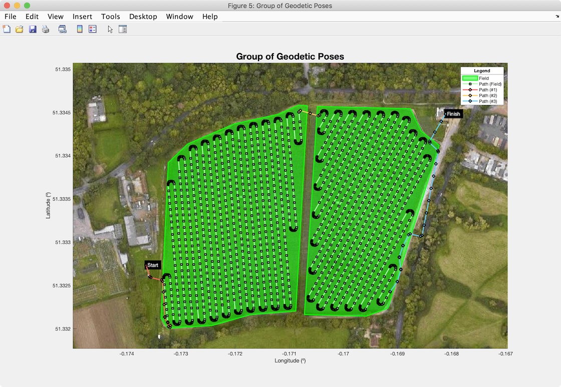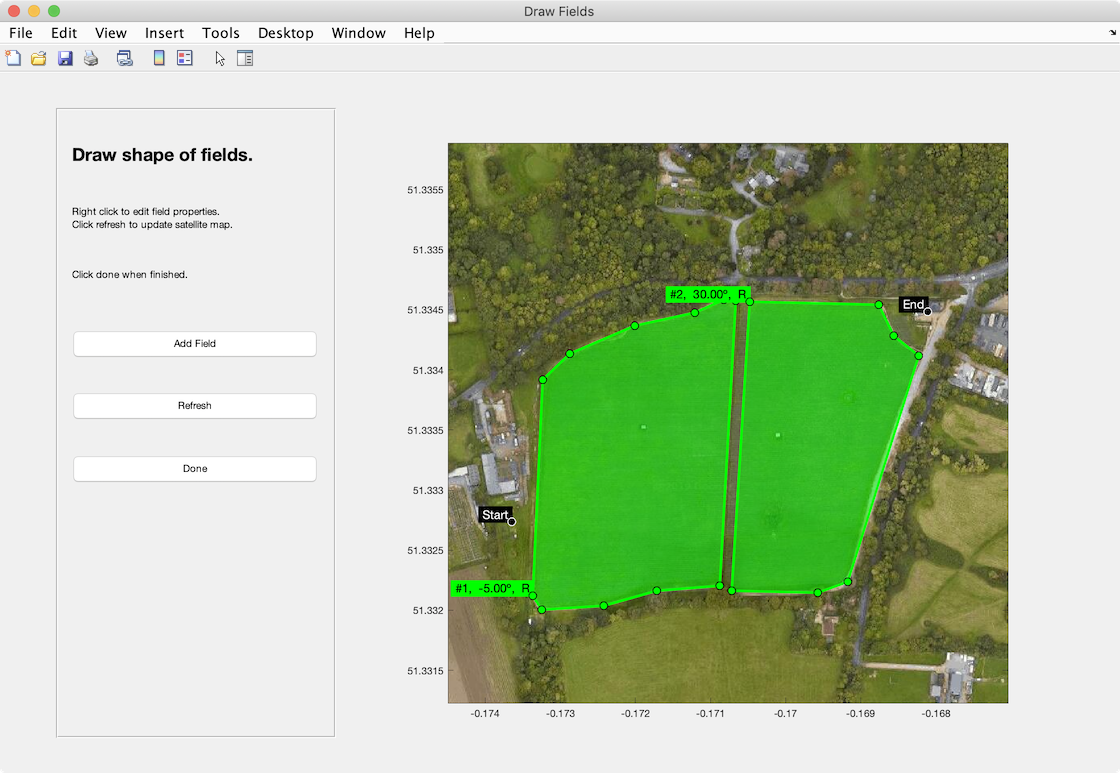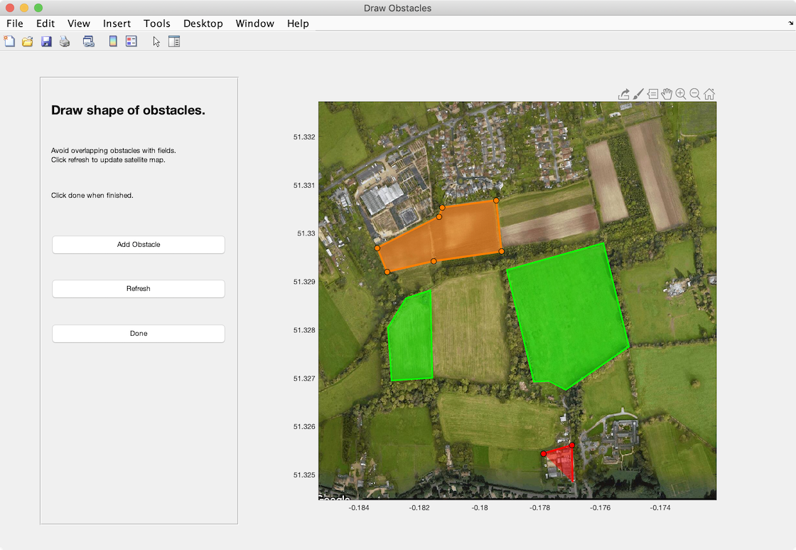 Used MATLAB to create a full GUI program for designing automated-tractor missions. Program allows user to draw shapes of fields and obstacles and outputs the path tractor will follow to spray the fields.